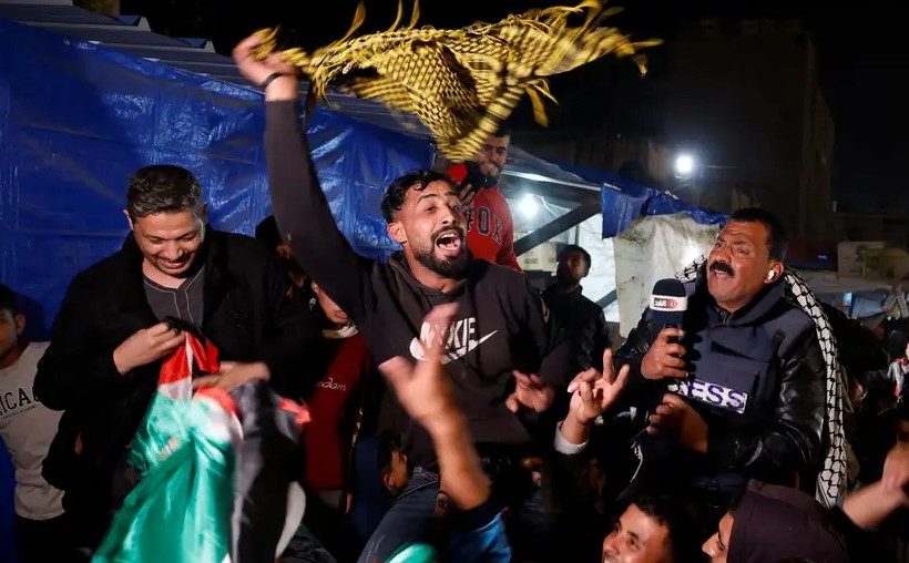 Την ίδια ώρα, στη Χαν Γιούνις και στη Γάζα Σίτι, οι Παλαιστίνιοι πανηγύριζαν με συγκρατημένη ελπίδα. Μικρά πλήθη συγκεντρώθηκαν σε πλατείες και έξω από νοσοκομεία, με χειροκροτήματα και ζητωκραυγές, ευχαριστώντας «όποιον συνέβαλε για να σταματήσει η αιματοχυσία».