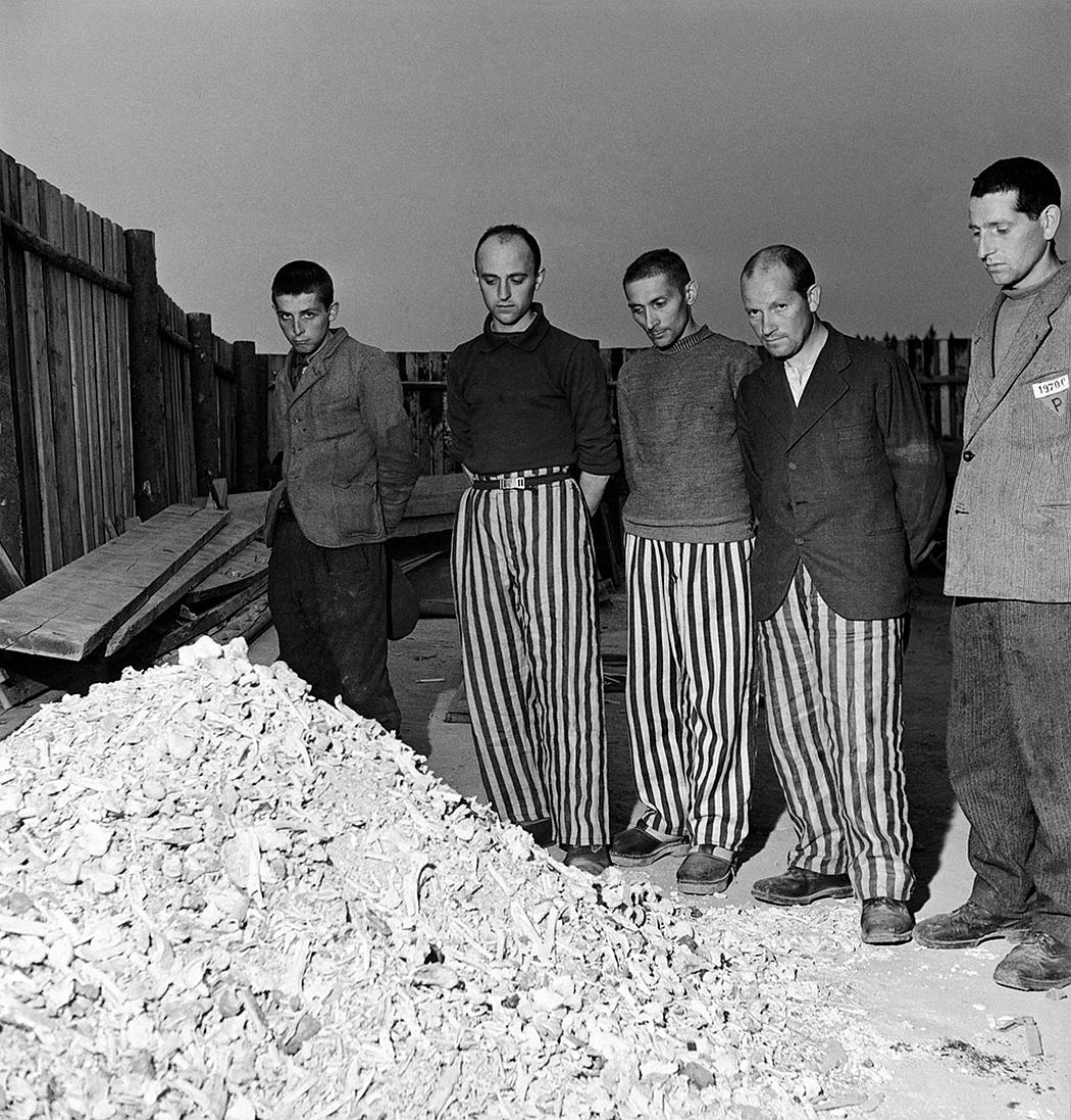 Αποφυλακισμένοι κρατούμενοι με ριγέ στολή φυλακής δίπλα σε σωρό οστών από πτwματα που κάηκαν στο κρεματόριο Buchenwald, Γερμανία, 1945. Πηγή: monovisions