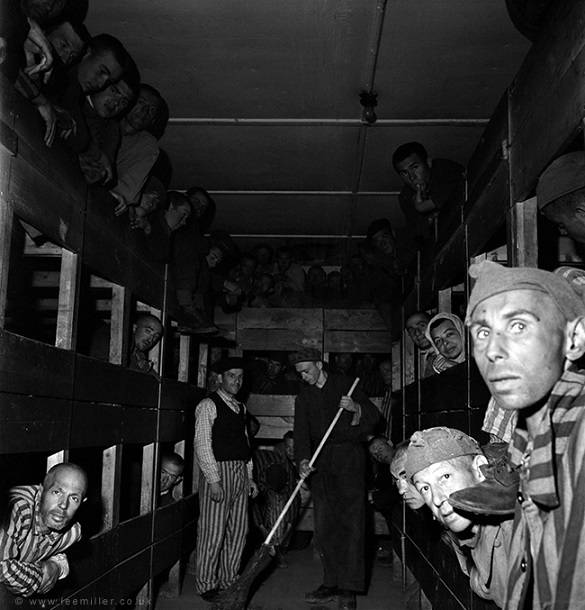 Αυτή η εικόνα, που τραβήχτηκε στο στρατόπεδο συγκέντρωσης Νταχάου το 1945, λίγο μετά την απελευθέρωσή του. Δείχνει αρκετούς κρατούμενους να κοιτάζουν την κάμερα από τις κουκέτες τους, ενώ ένας άλλος σκουπίζει τον κεντρικό διάδρομο. Πρόκειται για μια εικόνα που προσφέρει μια οδυνηρή συναισθηματική σύνδεση με τους κρατούμενους που αντιμετωπίστηκαν ως κάτι πολύ λιγότερο από άνθρωπο από τους απαγωγείς τους, με τα μάτια τους να είναι το κεντρικό σημείο της εικόνας. Πηγή: theartstory