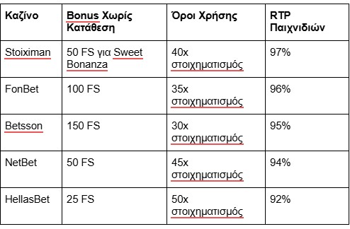 Αυτός ο πίνακας σας βοηθά να συγκρίνετε τις προσφορές μπόνους για νέους παίκτες από διάφορα καζίνο και να επιλέξετε το πιο συμφέρον για εσάς. Θυμηθείτε πάντα να διαβάζετε προσεκτικά τους όρους και προϋποθέσεις πριν διεκδικήσετε οποιοδήποτε bonus.
