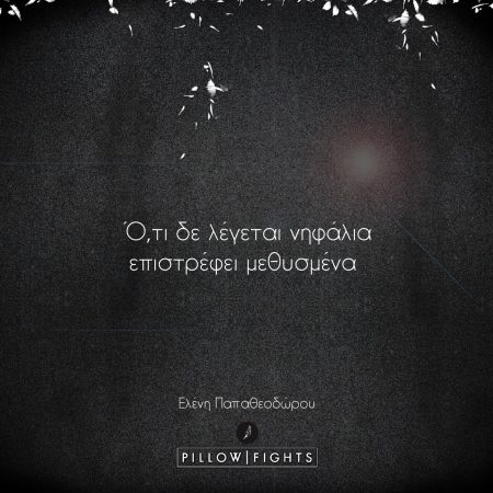 Κι όσο το καταραμένο το αλκοόλ διεισδύει πιο πολύ μέσα μου και το νιώθω να μ’ ακινητοποιεί, η ανάσα μου βαραίνει και το κεφάλι μου είναι έτοιμο να εκραγεί. Ακριβώς, όπως την πρώτη φορά που σ’ φίλησα. Τι το ήθελα πάλι και σε θυμήθηκα; Μια χαρά είμαι όσο σε έχω ξεχασμένο. Αλλά μάλλον ξεγελάω τον εαυτό μου λέγοντάς μου πως δε νιώθω τίποτα πια.